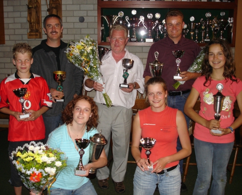 Bij de jeugd werd dit jaar op kleine klosjes geschoten en het was jeugdkoningin Linsey Gerrits die haar klosje al in 3 schoten liet verdwijnen. Hiermee mag ze zich clubkampioen bij de jeugd noemen. Uiteraard was er ook dit jaar weer een onderdeel vrije hand waarin door dames en heren samen wordt geschoten in hetzelfde onderdeel. Na een zeer aardige strijd was het Frans Kusters die zich tot clubkampioen vrije hand schoot. Jos Vloet eindigde net achter hem en gaat daarmee de boeken in als reserve kampioen vrije hand. Hieronder zijn alle prijswinnaars nog eens op een rijtje te zien. Laten we voor volgend jaar hopen op net zo’n mooi weer, net zoveel deelnemers en net zo’n mooie strijd.