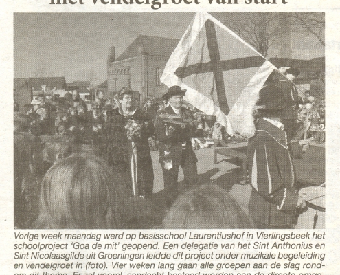 Maandag heeft ons gilde op basisschool Laurentiushof in Vierlingsbeek meegeholpen met de opening van het schoolproject met de naam “Goa de mit”. In dit project zullen de leerlingen van de school gedurende vier weken kennismaken met allerlei aspecten uit de directe omgeving. Zo zal de geschiedenis van de dorpen Vierlingsbeek en Groeningen aan de orde komen en zullen historische gebouwen en monumenten besproken worden. Ook zal aandacht worden geschonken aan de natuur en aan verschillende verenigingen in de omgeving.