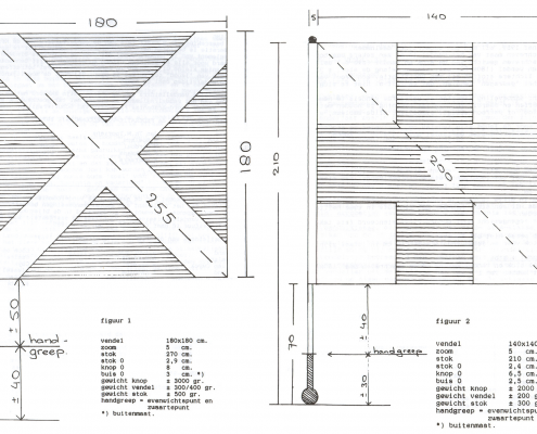 Compleet zal stok en vendel met de boven omschreven maat 180 x 180 cm een gewicht hebben van ongeveer 4 kg. Voor de jeugdvendels, met een maat van 140 x 140 cm, zal het gewicht van stok en vendel ongeveer 2,5 kg zijn
