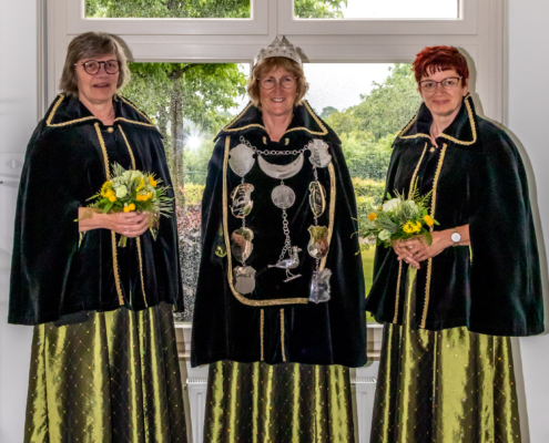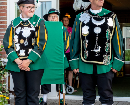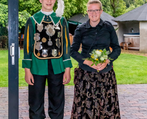 In de avond hadden de weergoden bedacht om ons te zegenen met een fikse bui die de rest van de avond zou duren. Dat maakte dat we het programma moesten aanpassen. De koningin en jeugdkoning werden dit jaar niet thuis ingehaald door het voltallige gilde, maar werden door het gildebestuur per auto opgehaald en naar “De Zandpoort” gebracht. Hier stond binnen een erehaag voor hen klaar. De trom- en vendelhulde werden eveneens binnen gegeven. Daarna kon de receptie en het koninginnebal beginnen. Tijdens het koninginnebal werden onze jubilarissen gehuldigd en ontvingen zij hun zilveren jubileumschildje. Dit waren Harm Thijssen, Sjef Versteegen en Jan de Vos. Hans Gerrits en Huub Huibers waren al eerder jubilaris, maar door de pandemie was hun huldiging uitgesteld naar deze avond. Maik Vloet zal op een later tijdstip zijn schildje in ontvangst nemen. Op deze avond zijn ook de nieuwe Gildtmeesters bekend gemaakt. Tinie Martens mag voor 2 jaar deze taak vervullen en Erwin Vousten gaat deze rol voor 1 jaar op zich nemen. Gildtmeesters zijn o.a. verantwoordelijk voor het (konings)zilver en zij mogen deelnemen aan de bestuursvergaderingen.