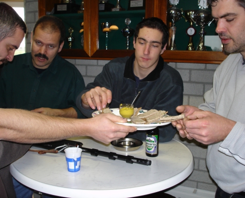 Vervolgens werden er prijzen uitgereikt aan de 6 beste schutters van de 21 overgebleven deelnemers. 6e is Jeroen Kuijpers geëindigd, met een score van 129,50 uit 7 geschoten series. Jac Gerrits werd 5e met een score van 130,20 uit 5 geschoten series. Theo van Kessel werd 4e (130,50 uit 4 series) en 3e werd Jan Loenen (131,25 uit 4 series). Als tweede is Maik Vloet geëindigd met een score van 131,50 uit 4 geschoten series. En de clubkampioen kruisboogschieten 2005 is Marcel de Vos geworden met een gemiddelde score van 133,00 over een drietal geschoten volledige series. Naast de titel en een geldprijs (die hij overigens beschikbaar stelde om een nieuwe pijl aan te schaffen) ontving hij een medaille en een wisselbeker. Hierna kwam hoofdman Jac Gerrits aan het woord en hij bedankte de deelnemers en de organisatie. Gedurende de prijsuitreiking werd er rondgegaan met zure zult samen met roggebrood en mosterd. De zult was gemaakt door Lucy Kusters van de bij de koppenverkoop gewonnen varkenskoppen. Deze hapjes vielen, zoals op de foto te zien is, goed in de smaak.