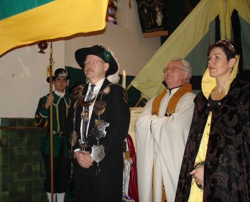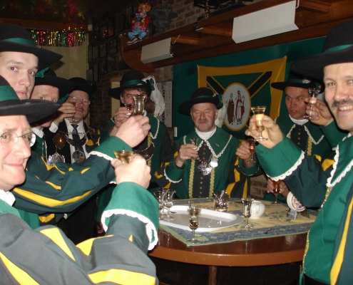Na het buffet was er het gezellig teren voor alle gildebroeders en bovendien was er de gelegenheid een tentoonstelling te bekijken met daarin onder andere het gildezilver en de onlangs teruggeschonken sabels. Ook de loterij was dit jaar in een nieuw jasje gestoken, met deze keer alleen prijzen die betrekking hadden op onze patroonheilige St. Anthonius Abt. De trekking werd verricht door onze koning Alby Jans en onze eigen patroonheilige Rinus Thijssen mocht de prijzen uitreiken, variërend van door Lucy Kusters gemaakte zult tot een tegoedbon voor twee uur werken op de boerderij van gildebroeder Jan Jans! Na de loterij was het nog geruime tijd gezellig en we kregen zelfs nog een bezoek van Prins Erwin dun Urste met zijn gevolg. De volgende dag begon weer zoals gebruikelijk in de kapel van Groeningen met een Heilige Mis voor alle levende en overleden gildebroeders. Hierna was er de traditionele koppenverkoop ten bate van de kapel, welke ruim € 2.400,- opleverde. Al met al waren het een aantal geslaagde dagen waar we met plezier op terug kunnen kijken.