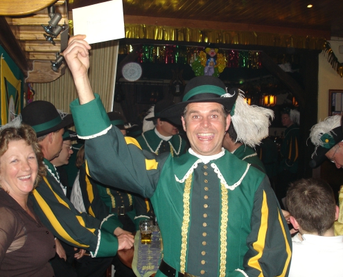 Afgelopen zondag was de eerste St. Tunnis in nieuwe stijl, zoals besloten was op de afgelopen jaarvergadering. Voordat we met alle leden naar de kapel van Groeningen trokken voor de Heilige Mis, hing Jan Ebben symbolisch het 1e Deken-schild bij zijn opvolger Robby Willems om. Hierna was het tijd voor de Heilige Mis in de kapel en werd er geofferd op de gildetrom door alle aanwezige kerkgangers. Na de Mis zijn we allemaal naar “De Zandpoort” gegaan, waar de hoofdman een welkomstwoord sprak. Hierna was het tijd voor het ontbijtbuffet voor alle leden met partners, dat dit jaar voor de eerste maal plaats zou vinden. Het uitstekende gezamenlijke buffet, was erg gezellig en voor herhaling vatbaar. Het geheel werd wat opgevrolijkt door drie figuranten, die tijdens het eten komische acts opvoerden.