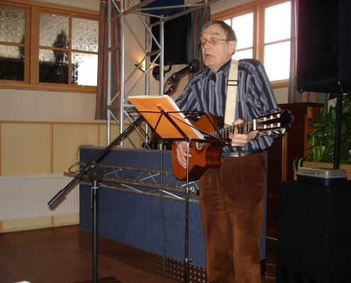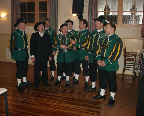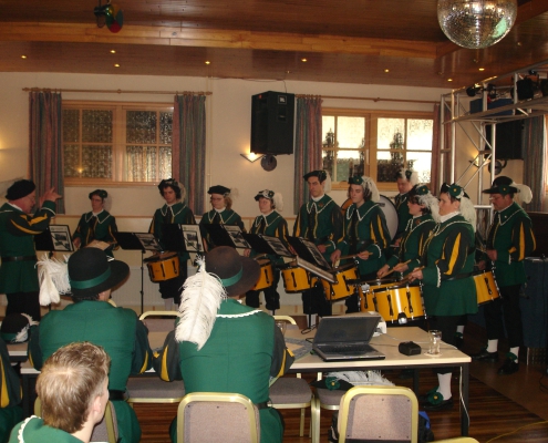 Hierna was het tijd voor de koffietafel voor alle leden met partners, iets wat vorig jaar goed in de smaak viel. Het uitstekende gezamenlijke buffet was erg gezellig en wederom zeker voor herhaling vatbaar. Tijdens het buffet kon iedereen bijpraten met elkaar en werd er door Servaas Frissen sfeervolle achtergrondmuziek op de piano verzorgd. Ook kon men oude foto’s en films van ons gilde voorbij zien komen op groot scherm. Er was zelfs de mogelijkheid voor iedereen om een dvd met oude videobeelden van 1970-1984 te bestellen voor een bedrag van € 5,00 (waarvan € 2,50 zal worden gebruikt voor de aanschaf van het nieuwe hoofdvaandel). Na het buffet was er een dubbel optreden van gilde-troubadour Henk Habraken uit Heeswijk-Dinther. In twee maal een half uur zong hij op mooie wijze over het gildewezen in het algemeen en over gebeurtenissen bij ons gilde in het bijzonder. Zo zong hij over het afscheid van Liesbeth School, de verdiensten van Maik Vloet en Marc Peters, onze nieuwe jubilarissen Sjef Versteegen en Jan Ebben en koning Jan Jans. Ook het aftreden van Jac Gerrits en Erwin Vousten en zelfs onze patroonheilige en Peter Gooren werden in de liederen opgenomen. Het optreden viel goed in de smaak bij de aanwezigen. Hierna gaf onze eigen drumband een goed verzorgd optreden waarbij als klap op vuurpijl een nieuw ingestudeerd nummer op originele wijze werd uitgevoerd.