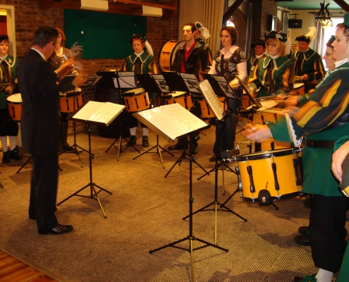 Na de koffietafel was er een optreden van de drumband onder leiding van de nieuwe instructeur Harry van Bakel. Er werd op een indrukwekkende manier een aantal nummers ten gehore gebracht. Het optreden viel goed in de smaak bij de aanwezigen. Hierna werd een mooi beeldje van een bizon verloot onder de aanwezigen. De verloting ging per opbod, op de manier zoals de dag erna de koppenverkoop plaats zou gaan vinden. Het beeldje was aangeboden door een kunstenaar uit Groeningen (dhr. B. Venneman) en de opbrengst (€ 365,00) komt ten goede aan het gilde en de kapel van Groeningen. De gelukkige winnares van het beeldje was Alda School. Vervolgens werd er een aantal presentaties gegeven over de vorderingen van het Gildenfestijn in Groeningen volgend jaar. Door elke commissie werd besproken wat er al is gebeurd en wat de plannen zijn. Het zag er allemaal goed uit en we zijn samen goed op weg met de voorbereidingen.