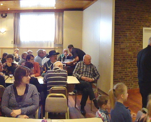 Nadat alle tafels weer waren leeggeruimd werd de aandacht gevraagd voor onze eigen drumband. Door Frans Kusters en Lucy Kusters werd stilgestaan bij het vertrek van onze instructeur Harry van Bakel en de komst van de nieuwe instructeur Hans Simons. Harry kreeg een presentje voor zijn jarenlange inzet en de drumband bracht een aantal nummers ten gehore. Voor de gelegenheid deed Harry zelf ook nog eens mee bij een van de nummers. Ook via deze weg willen we Harry graag bedanken voor zijn inzet en prestaties met onze drumband. Hans werd veel succes gewenst bij zijn nieuwe taak. Na deze optredens kregen we bezoek van ‘sleurklager’ Rien Bekkers! Deze buutreedner bracht ons een erg leuk optreden en ook sommige leden van ons gilde ontsprongen hierbij niet de dans! Na het optreden was men erg positief over dit korte maar krachtige optreden. Na afloop was het weer tijd voor het gezellig teren door de gildebroeders.