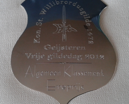 Uiteindelijk werd bekend gemaakt dat ons gilde er in was geslaagd om de Ereprijs te winnen, doordat we van de 30 deelnemende gilden het meeste aantal punten hadden behaald! Deze prijs hebben we de afgelopen jaren ook gewonnen op de Kringgildedag in Boxmeer op 16-05-2010 en de Vrije Gildedag in Heijen op 19-06-2011! Uiteraard was iedereen van ons gilde erg tevreden met deze bekroning op deze mooie gildedag. Het was dan ook nog erg gezellig in de feesttent. Helaas zat het weer niet mee, maar het geheel was erg goed georganiseerd door het Koninklijk Sint Willibrordusgilde van Geijsteren. We willen dit gilde hier dan ook zeker voor bedanken.